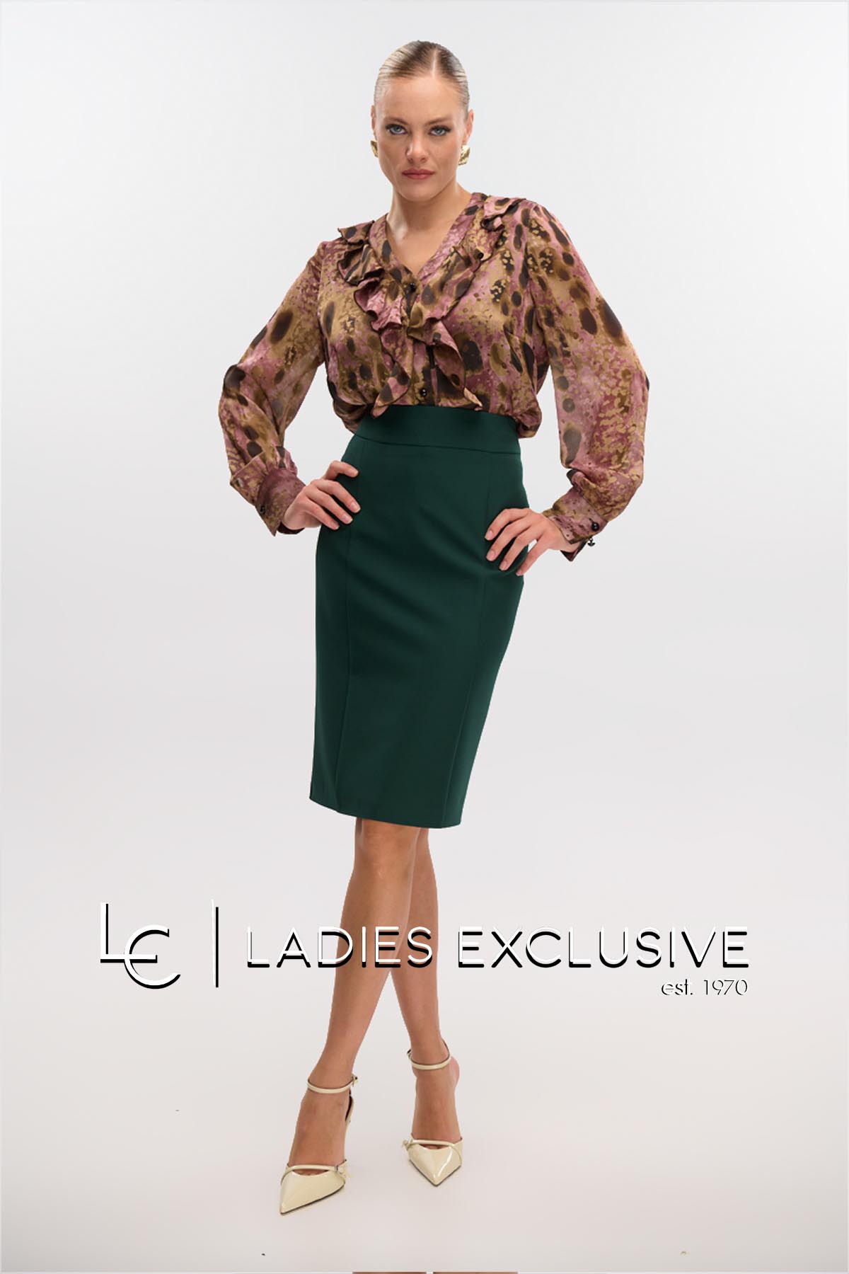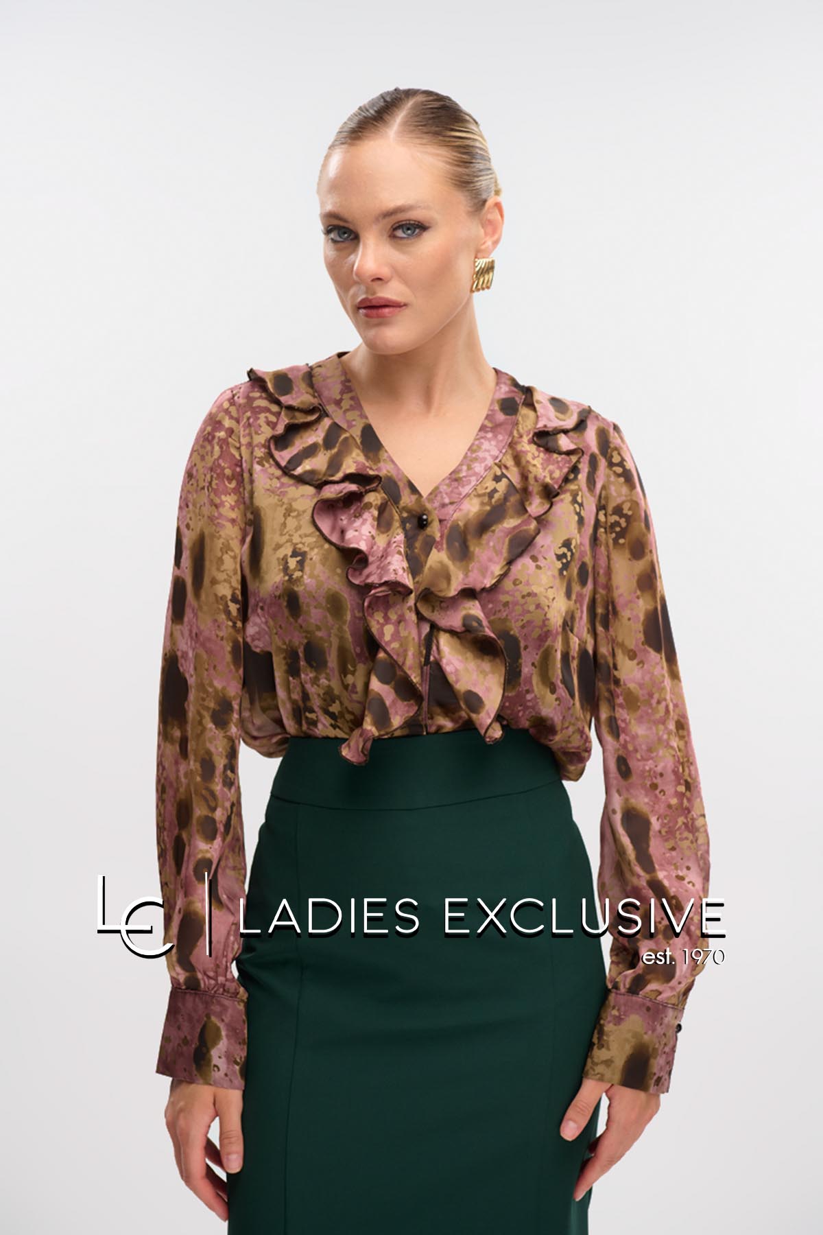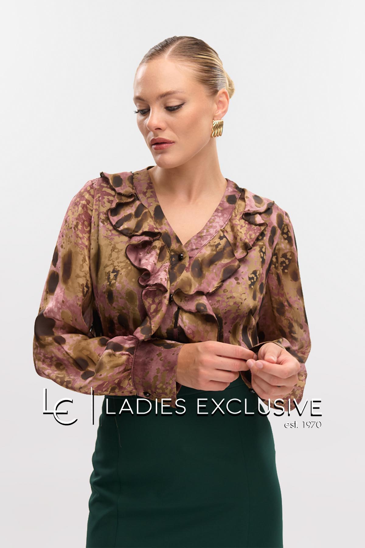FIBES Πουκάμισο σε αποχρώσεις χακί σατέν με άνοιγμα v και βολάν.