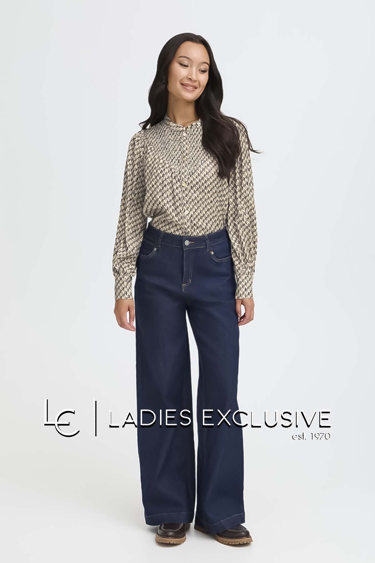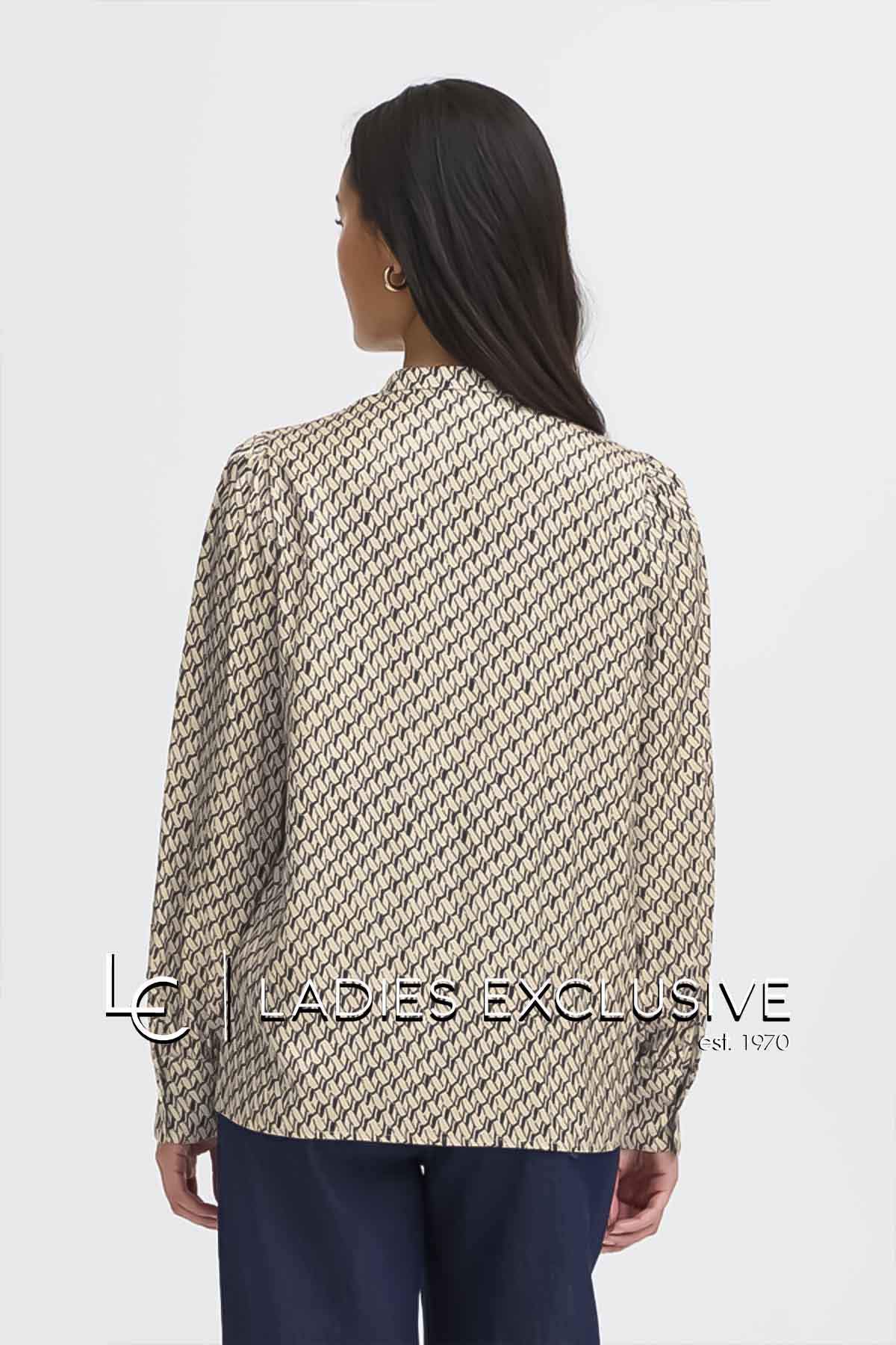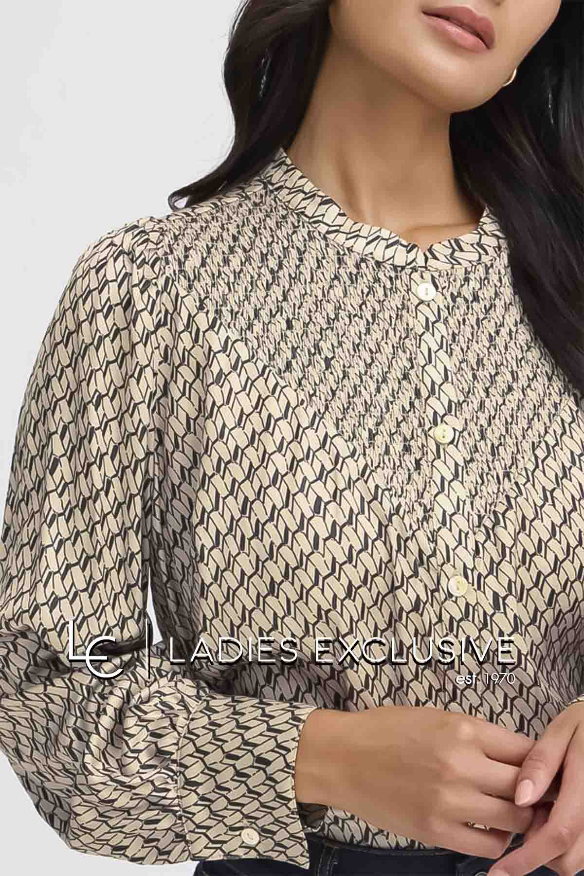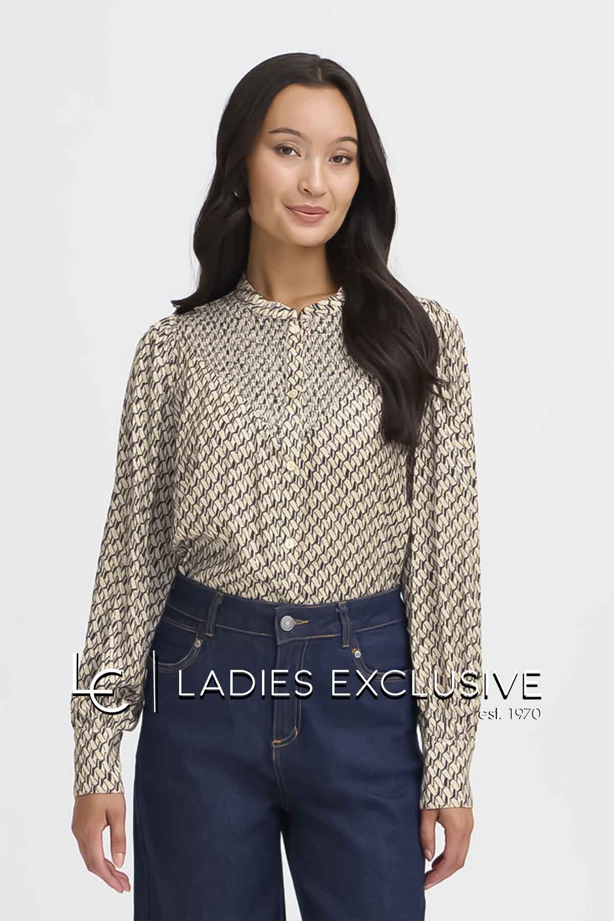 FRANSA Πουκάμισο μπεζ με μπλε σχέδια ριχτό χωρίς πέτο, με σούρα στο πάνω μέρος.