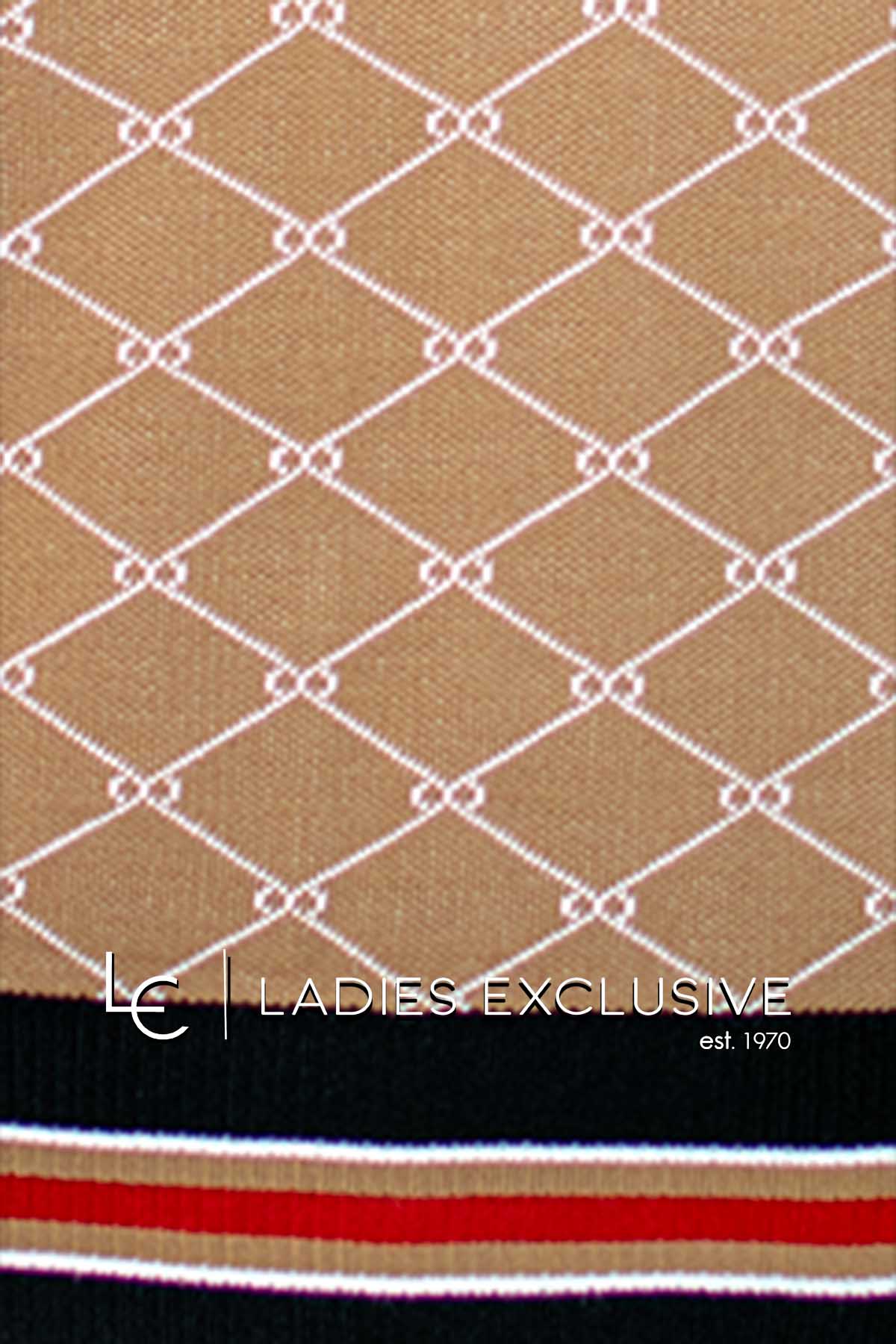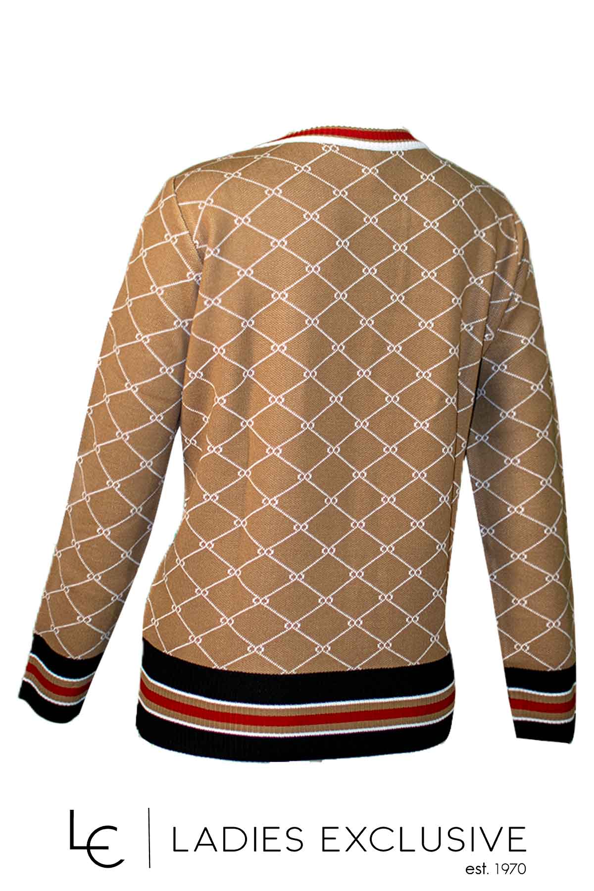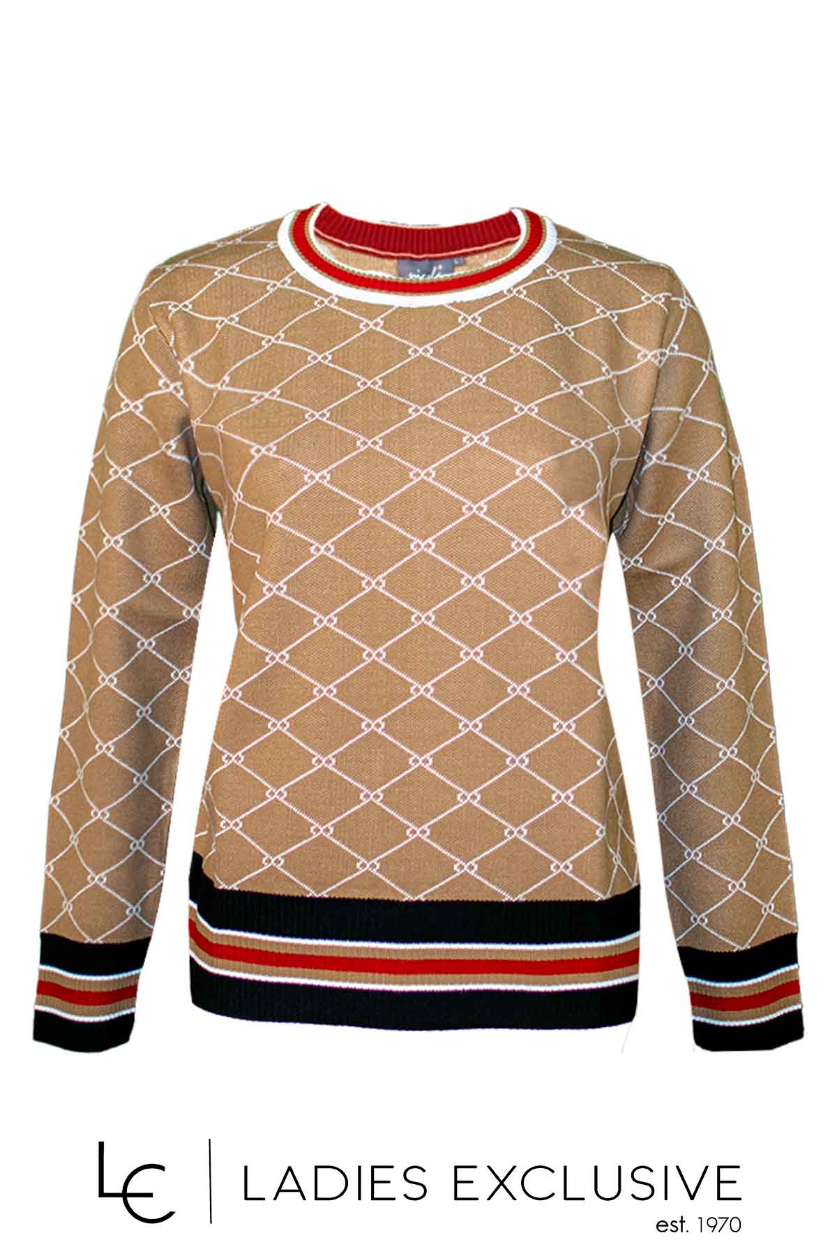 NICOLA Μπλούζα καμηλό μάλλινη με vintage σχέδιο και χρωματιστές ρίγες στα τελειώματα.