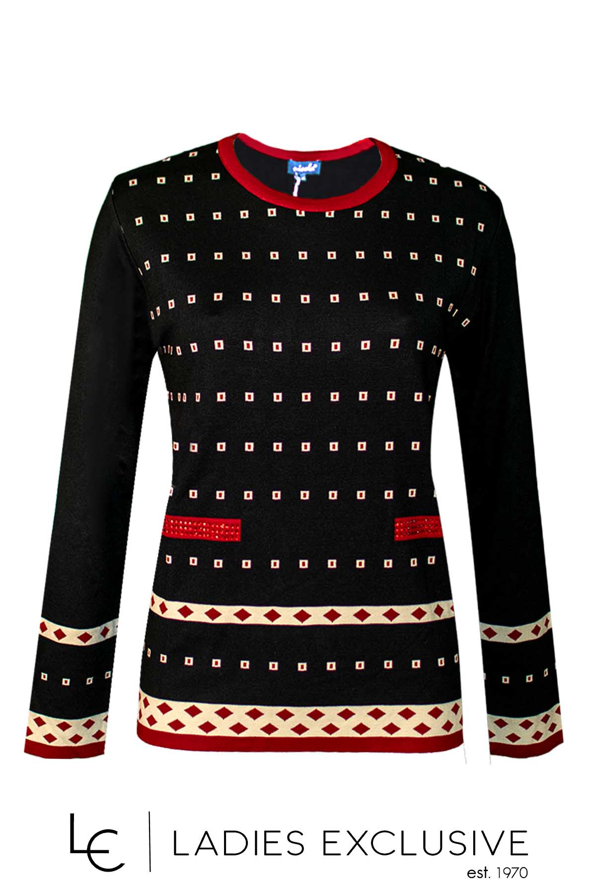 NICOLA Μπλούζα μαύρη με μικρά σχέδια και κόκκινες λεπτομέρειες με στρας.