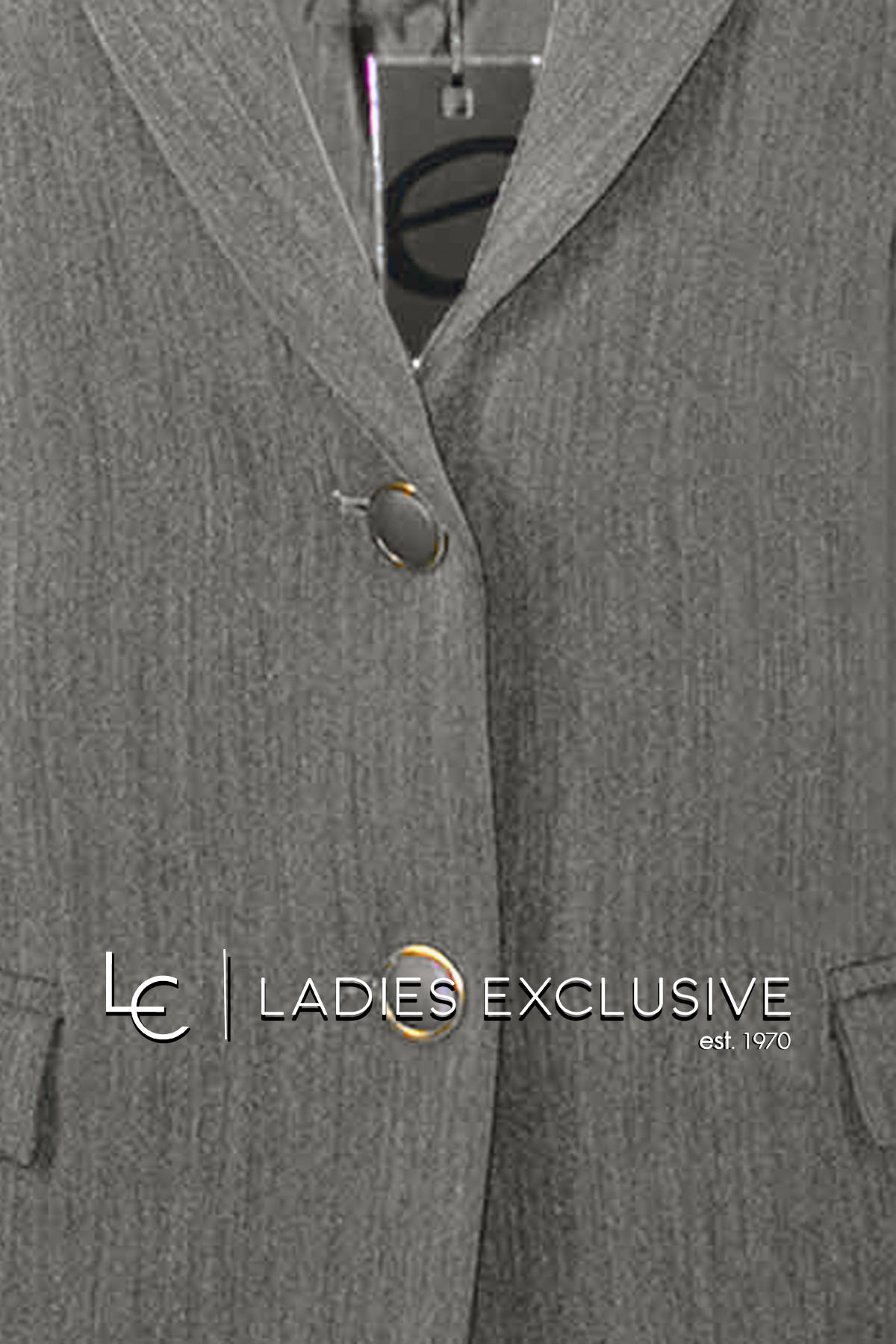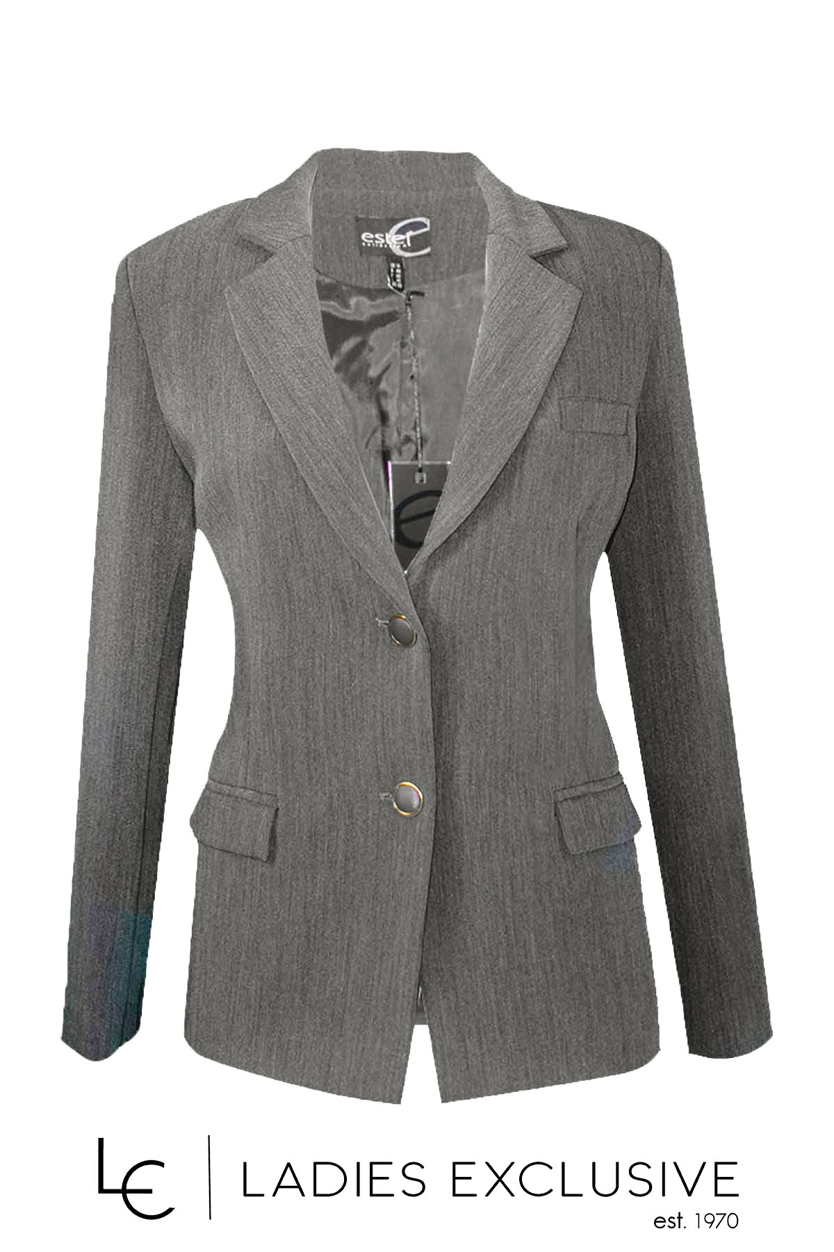 ESTEL Σακάκι γκρι με πέτο γιακά και τσέπες με καπάκια. Γίνεται σετ με το παντελόνι με κωδικό 08505-00.15 και με τη φούστα με κωδικό 08508-00.15.