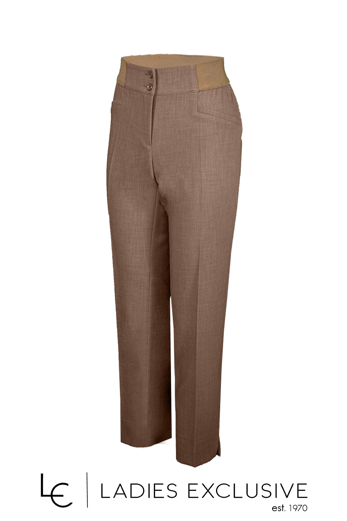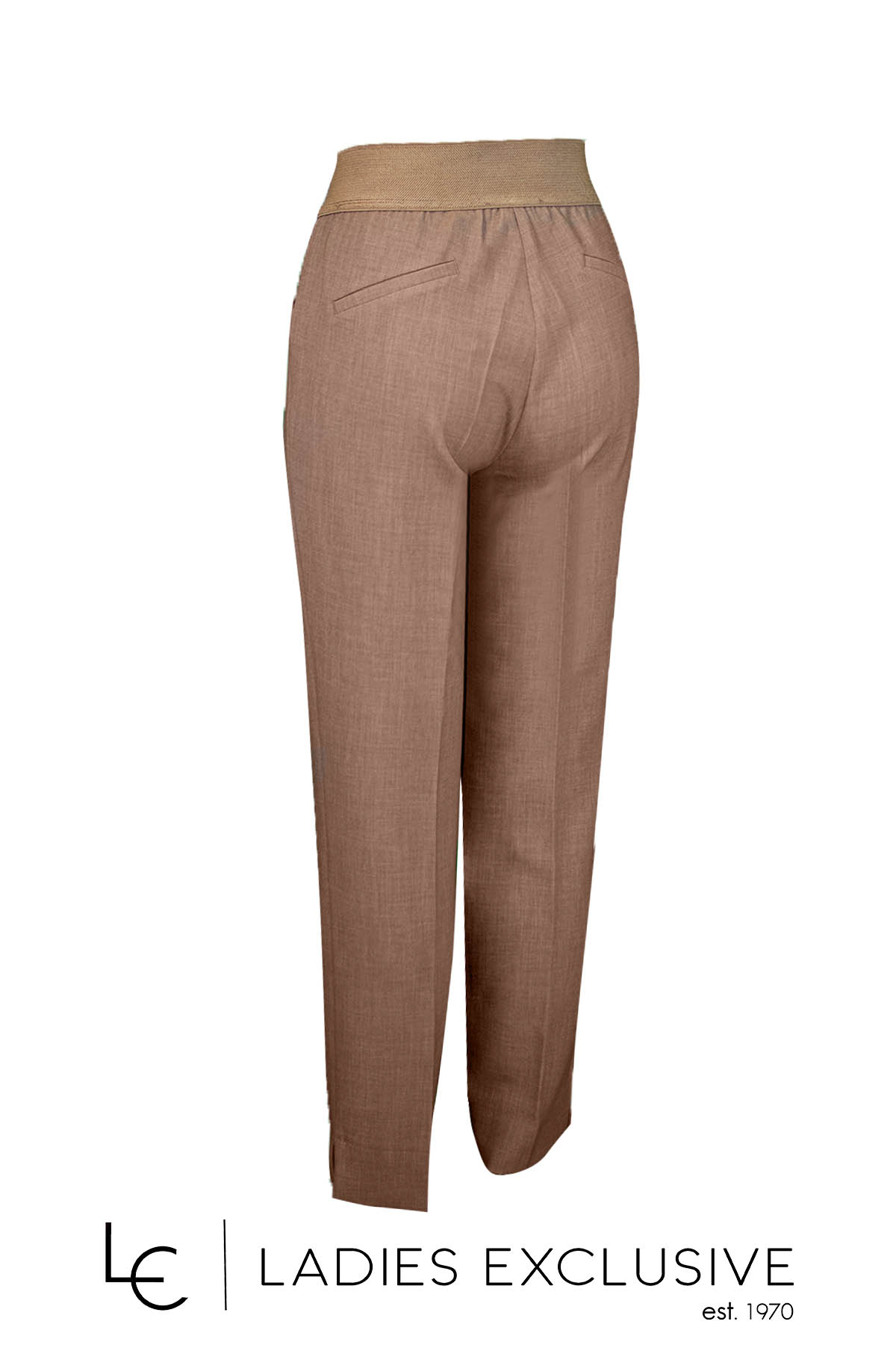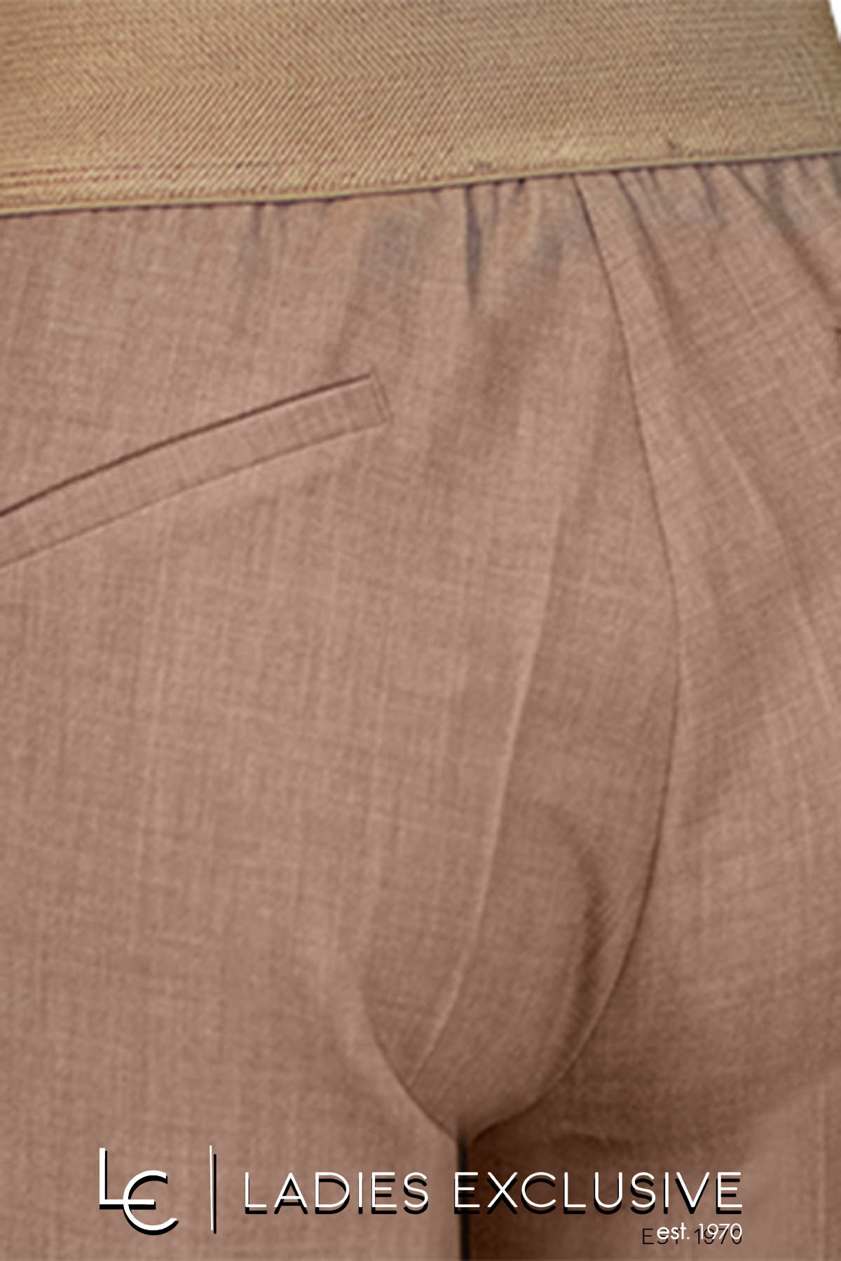 BELLA P. Παντελόνι μπεζ κρεπ ρεγιόν αστραγάλου με λάστιχο στη μέση και μικρό άνοιγμα στο κάτω μέρος.