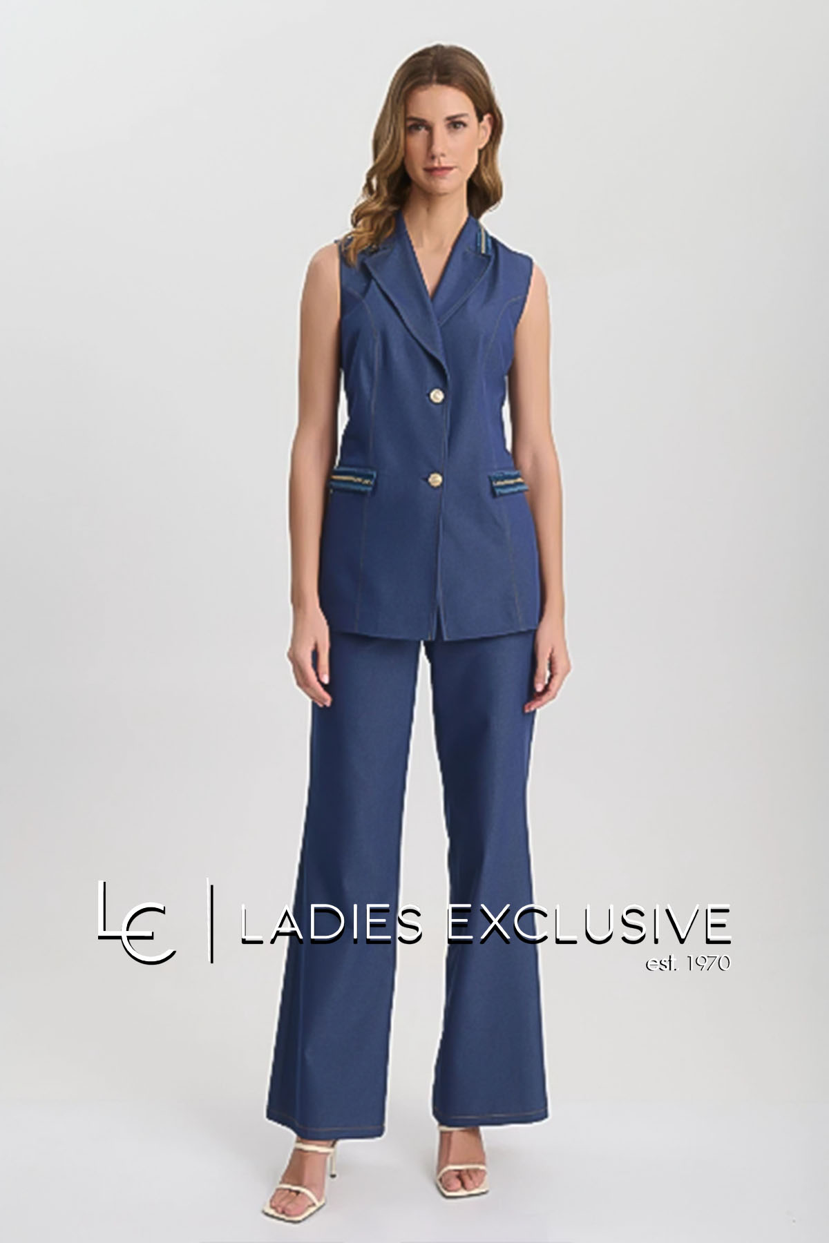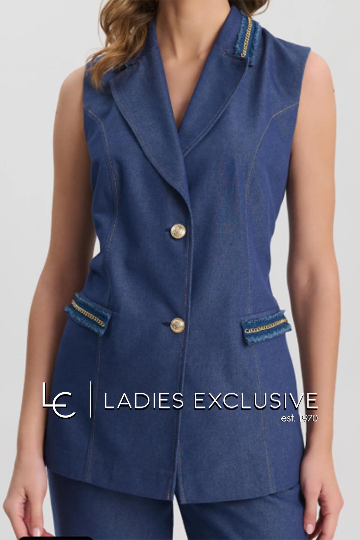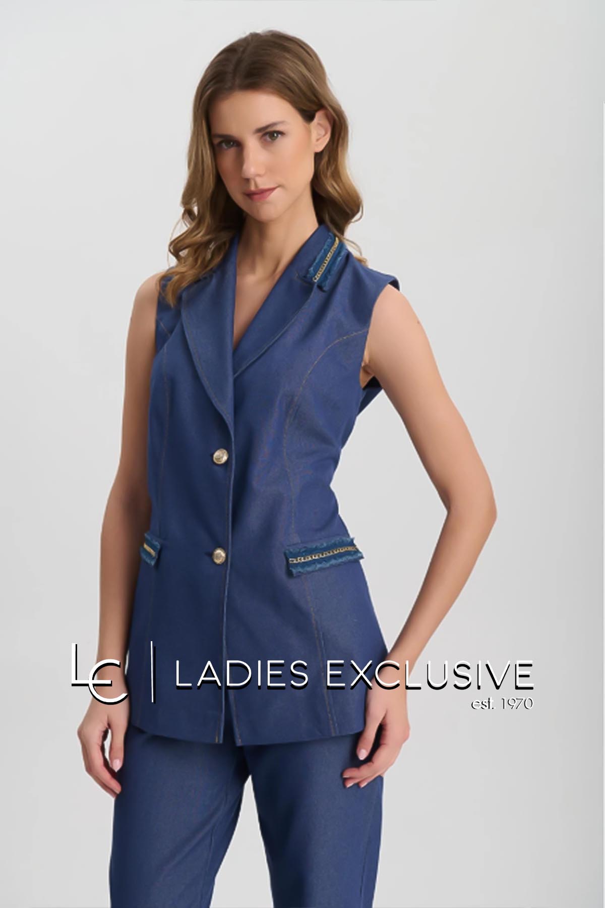 FIBES Σετ 2 τεμαχίων που αποτελείται από γιλέκο τζην με διακοσαμητικές τρέσες με αλυσίδα και παντελόνι μπλε τζην wide leg με λάστιχο στη μέση.