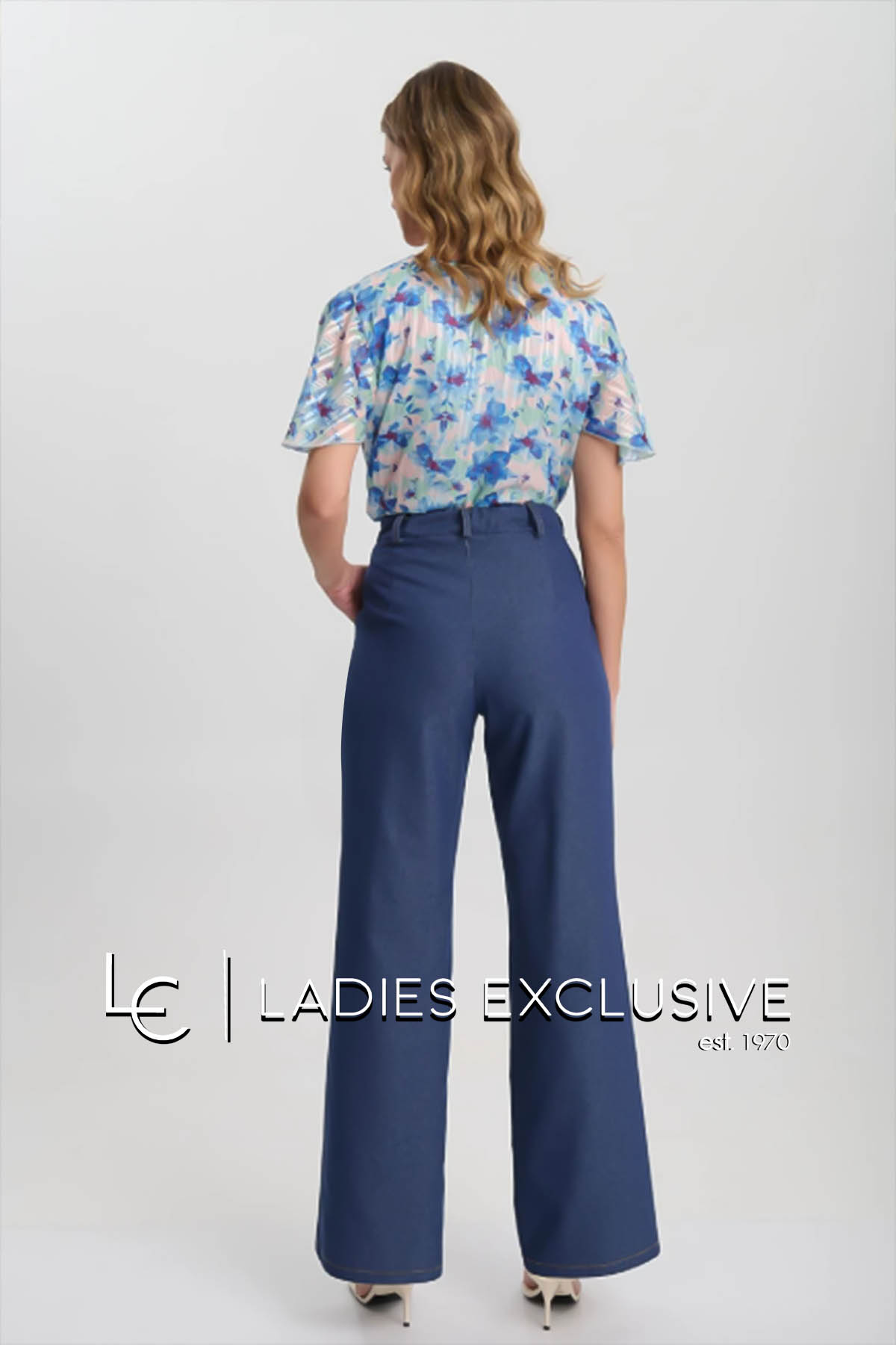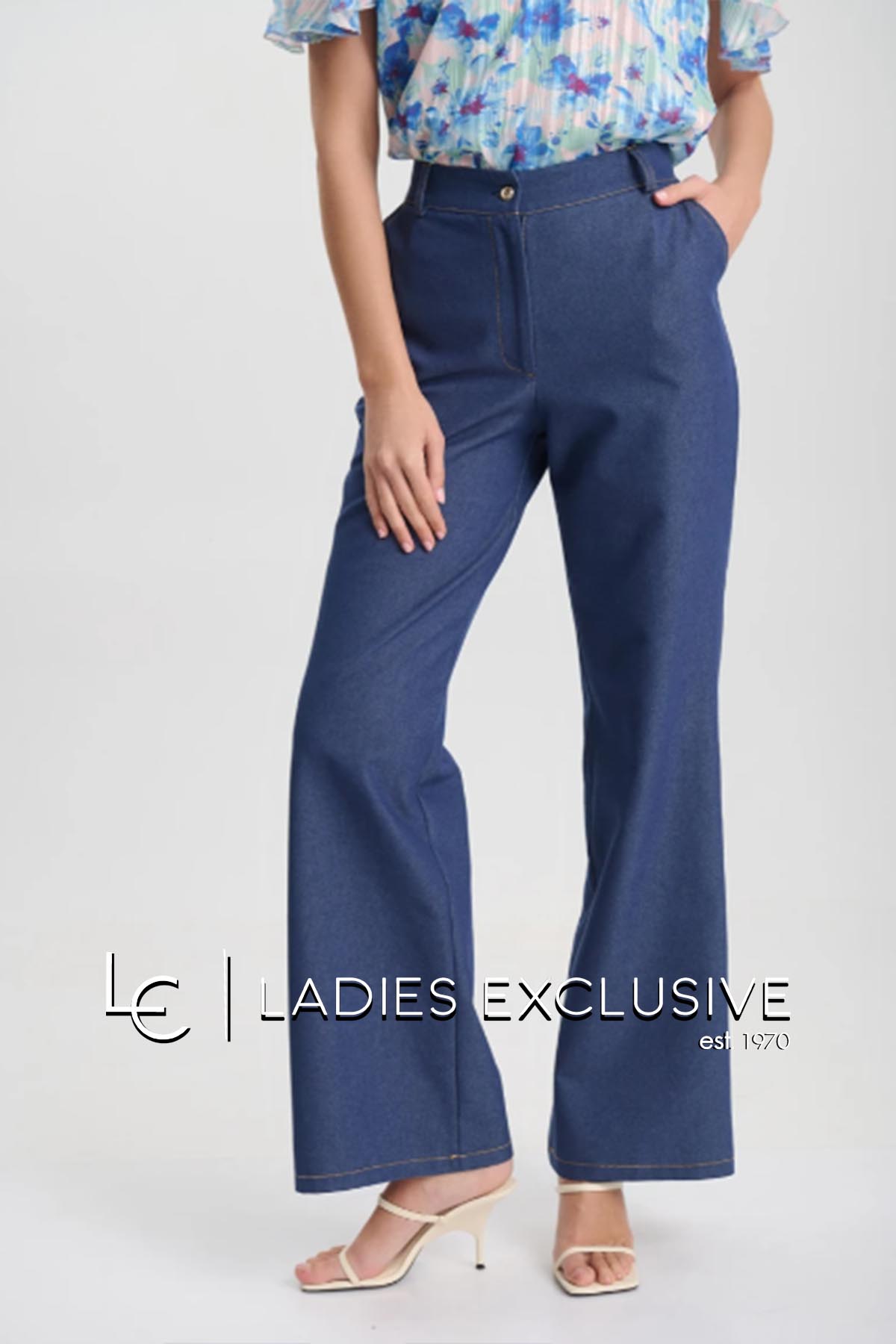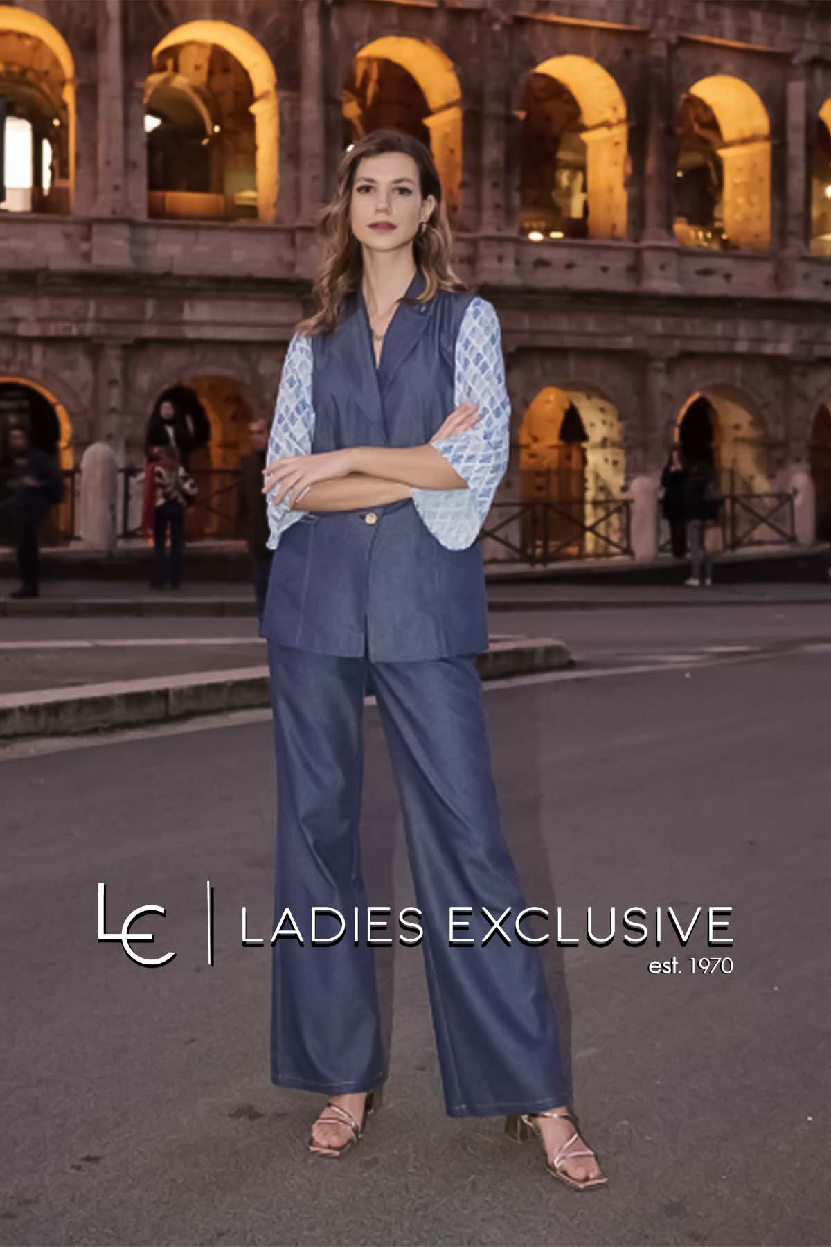 FIBES Σετ 2 τεμαχίων που αποτελείται από γιλέκο τζην με διακοσαμητικές τρέσες με αλυσίδα και παντελόνι μπλε τζην wide leg με λάστιχο στη μέση.
